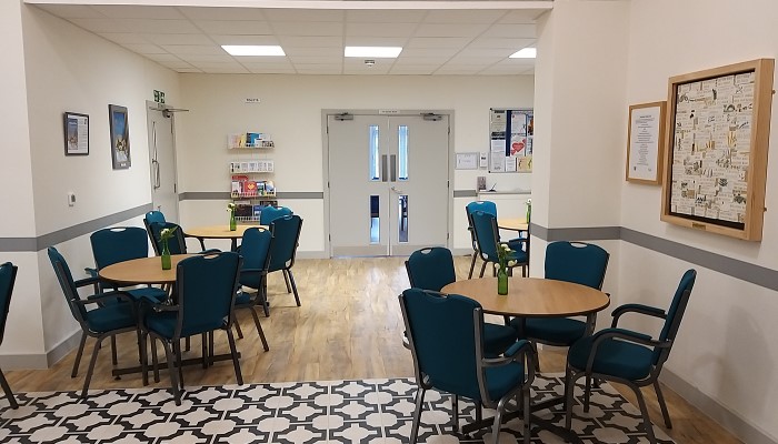 A view through the central hub towards the Garden Room. The framed ceramic artwork on the right is a tribute to the many groups and individuals who have contributed to the Centre's fundraising or helped in other ways. The artwork was made by June Mullarkey at Dersingham Pottery.